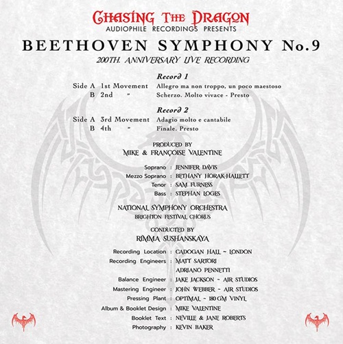 堪稱人類文化瑰寶的第九號交響曲是貝多芬畢生傑作,他於一八一八年開始創作,一八二四年初完成全曲。二O二四年是此曲完成的二百周年,於是追龍唱片決定發行此一偉大交響曲的紀念錄音,用當代最尖端的發燒錄音技術保留此一經典樂曲。在發燒圈早已樹立標竿的追龍唱片之前便推出「現場貝多芬系列」將樂聖的傳奇曲目採用發燒等級的錄音設備以現場錄音的方式留下珍貴錄音,這次選在倫敦的卡杜甘音樂廳錄製此一龐大編制的樂曲,留下臻於完美的傳奇經典!