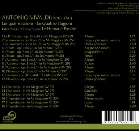 卡米諾拉以 Pietro Guarneri 名琴演奏,與古樂器組成的樂團融合為溫暖的音響效果,而在《夏》中,運弓迅速,神乎其技,將韋瓦第音符中火焰般的熱情靈魂徹底解放!而如此自然的發燒錄音,彷彿帶您進入教堂聆聽現場演奏,華麗堂音與古提琴的松香味,絕對讓您無法自拔!此外還增加了來自《愛之詩》專輯中的《愛慕》、《躁動》兩首協奏曲。這兩首作品為韋瓦第為孤兒院優異學生所作,透過卡米諾拉與快樂馬卡音樂家合奏團出神入化的演奏,加上24 K金CD優異的音質,更讓聽者欲罷不能,收藏價值遠勝原版!